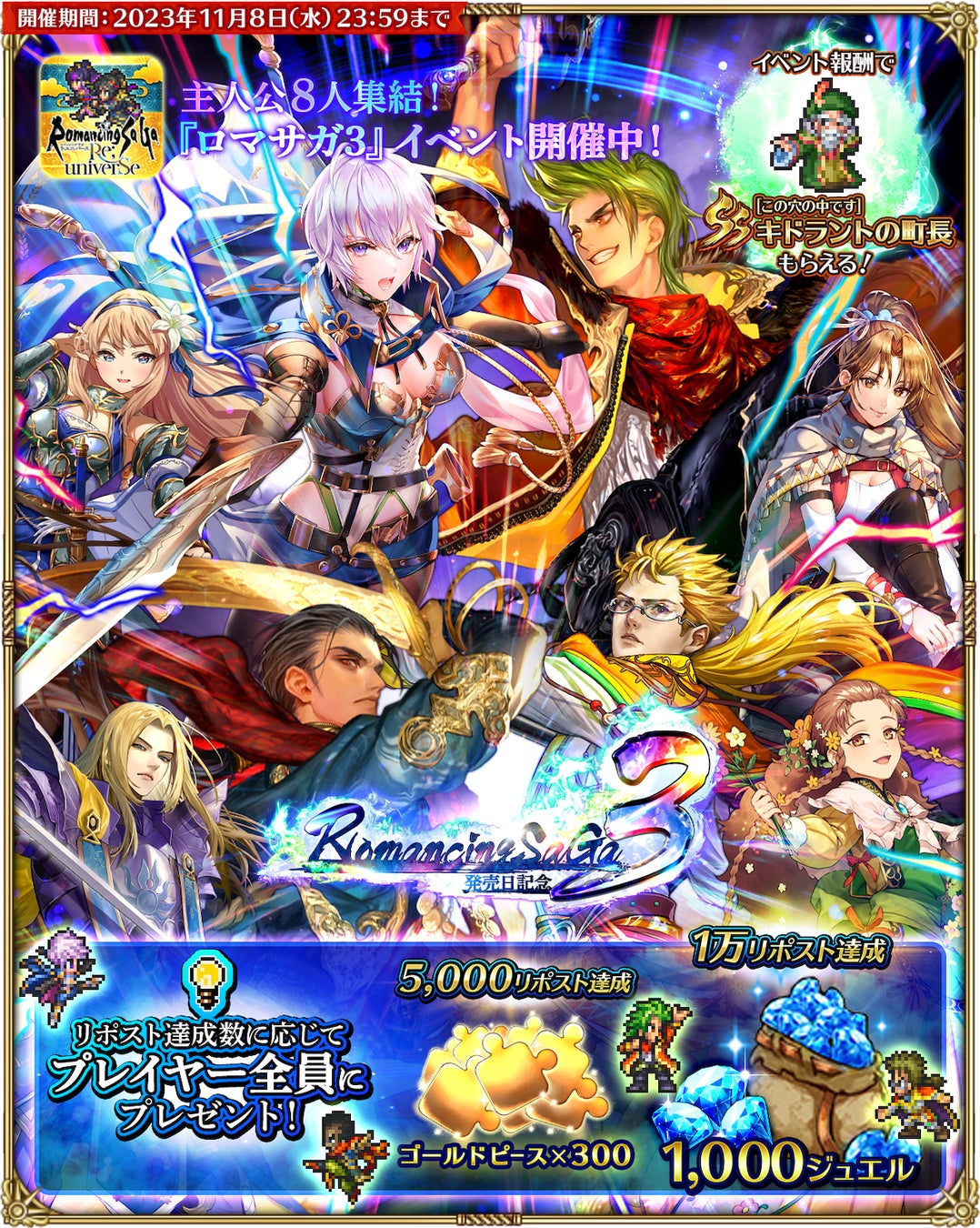 株式会社アカツキゲームスは、スクウェア・エニックスの人気ゲーム「ロマンシング サガ リ・ユニバース」において、2023年11月1日から「ロマンシング サガ3発売日記念キャンペーン 第1弾」を開催します。