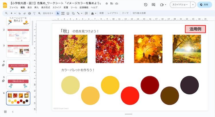 1. 「イメージカラーを集めよう」のテンプレート:自分で撮影した写真やGoogleスライドの画像から色を抽出し、オリジナルのパレット作りができます。