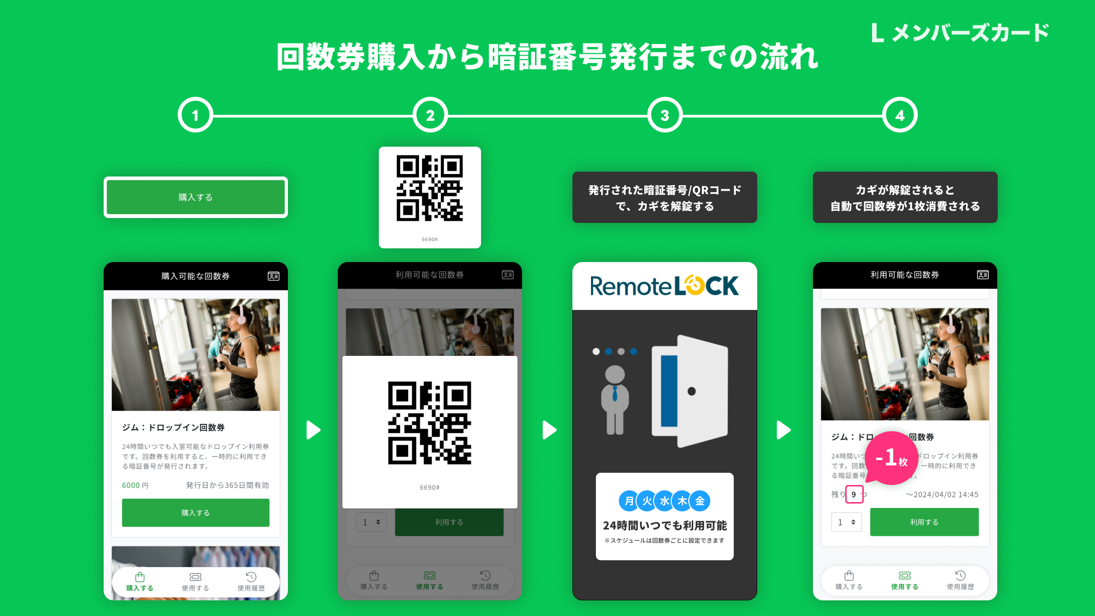 そこで、LINEデジタル会員証Lメンバーズカードの「回数券機能」とクラウド型スマートロック「RemoteLOCK」が連携することで、RemoteLOCK連携済みの回数券が、LINE上での事前決済で購入可能になりました。回数券と紐づいたRemoteLOCKの暗証番号・QRコードが発行されるため、カギ解錠が行われるたびに回数券が1枚ずつ消費されていきます。
