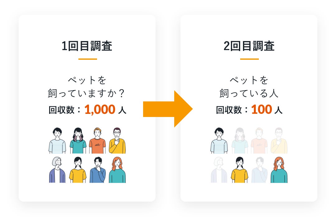 また、アンケートを2回に分けて実施することも可能で、1回目のアンケートで対象者を抽出し、2回目のアンケート(本調査)を行うことで、本調査対象者外からの回答を避けることができます。