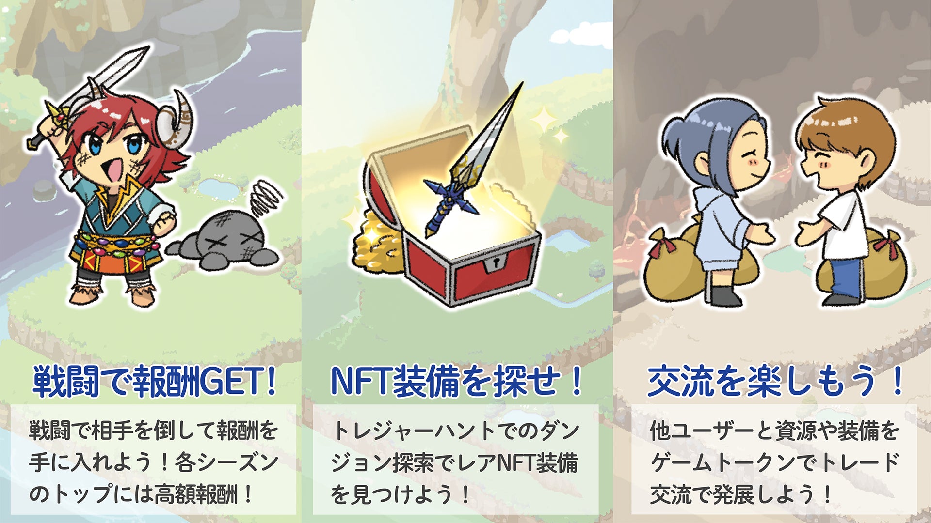 戦闘やダンジョン探索、ユーザーとの交流でゲームトークンやNFTを入手できます。