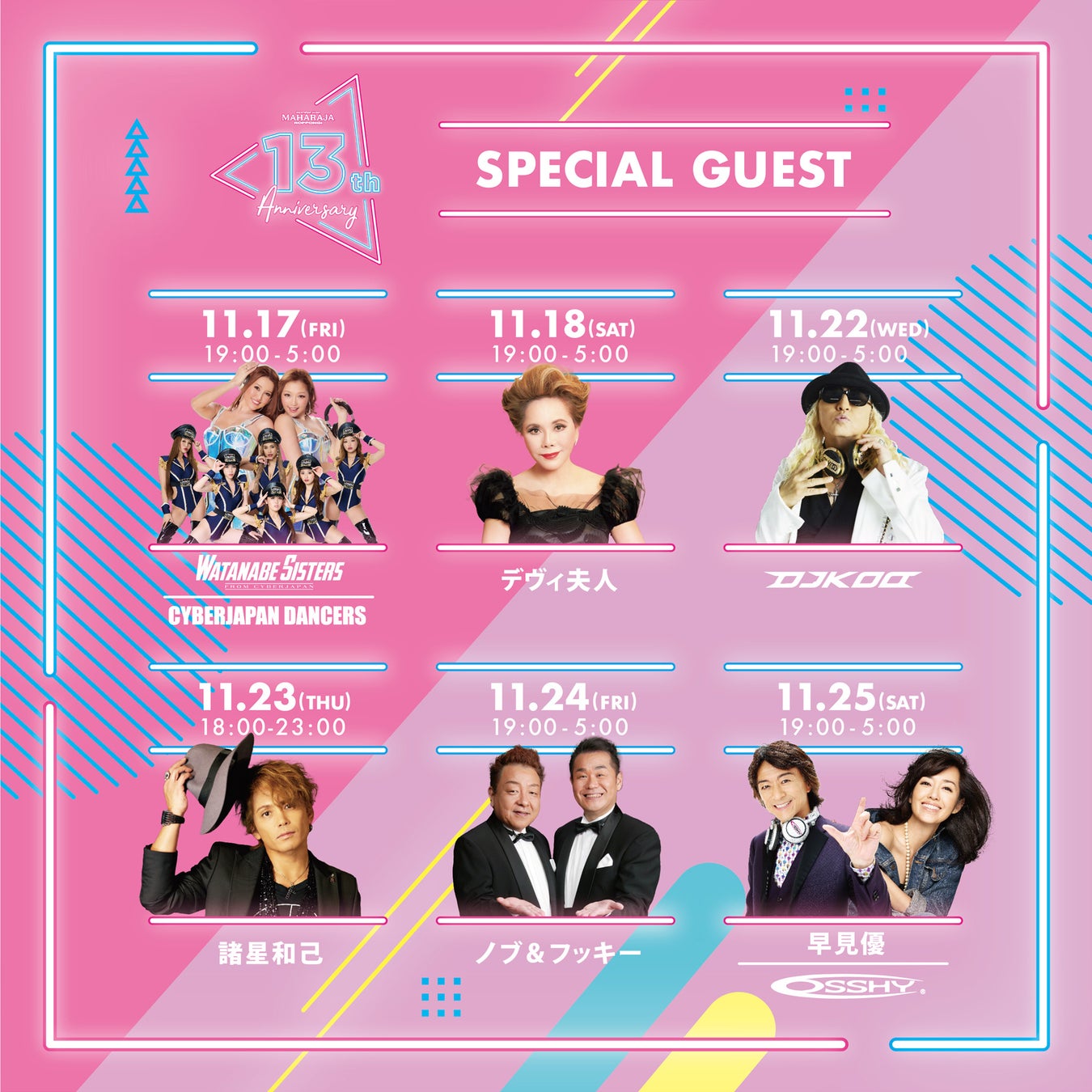 豪華なゲストと共に、最高のバブリーアニバーサリーをお楽しみください!特別ゲストには、WATANABE SISTERS/CYBERJAPAN DANCERS、デヴィ夫人、DJ KOO、諸星和己、ノブ&フッキー、早見優/DJ OSSHYが登場します。
