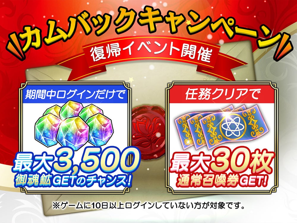 また、10日以上ログインしていないユーザー向けの復帰イベントも開催されています。
