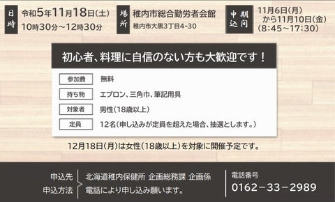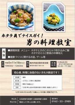 - 男性向けの料理教室は無料で、申込みは11月10日まで受け付けている。女性向けの料理教室も予定されている。