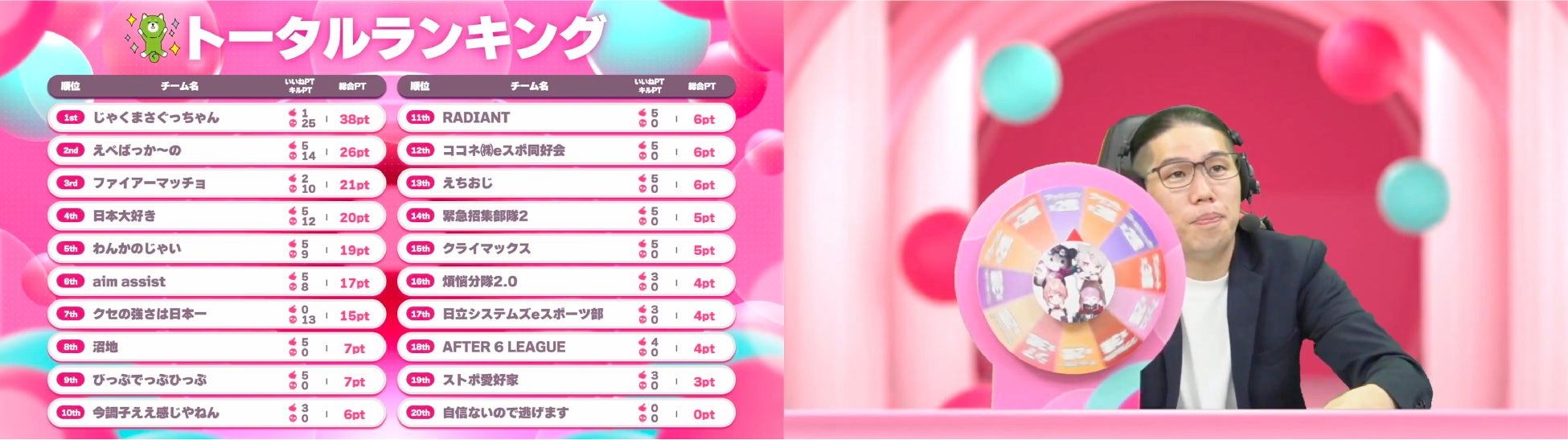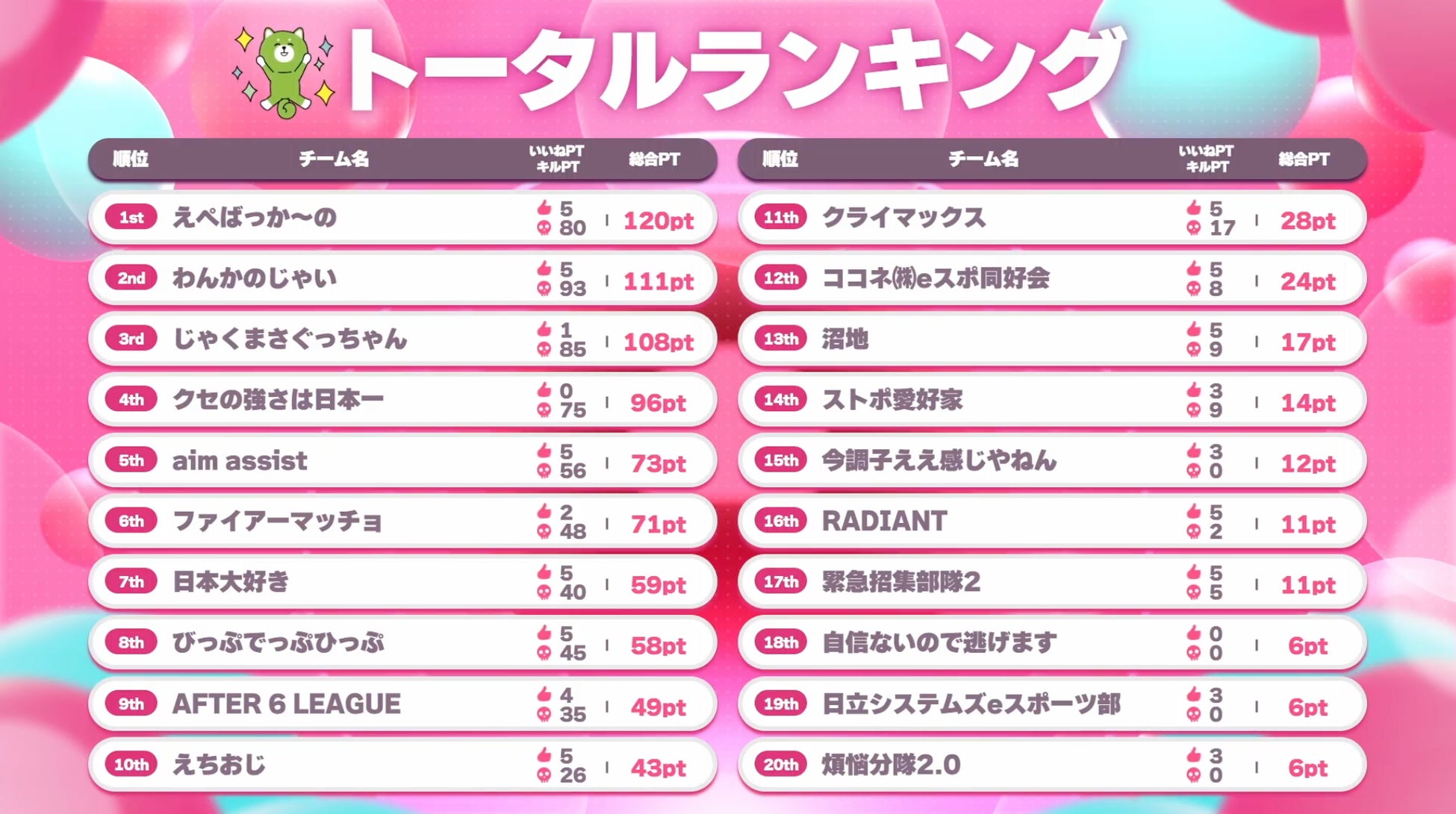 - トータルランキングで「じゃくまさぐっちゃん」が首位に