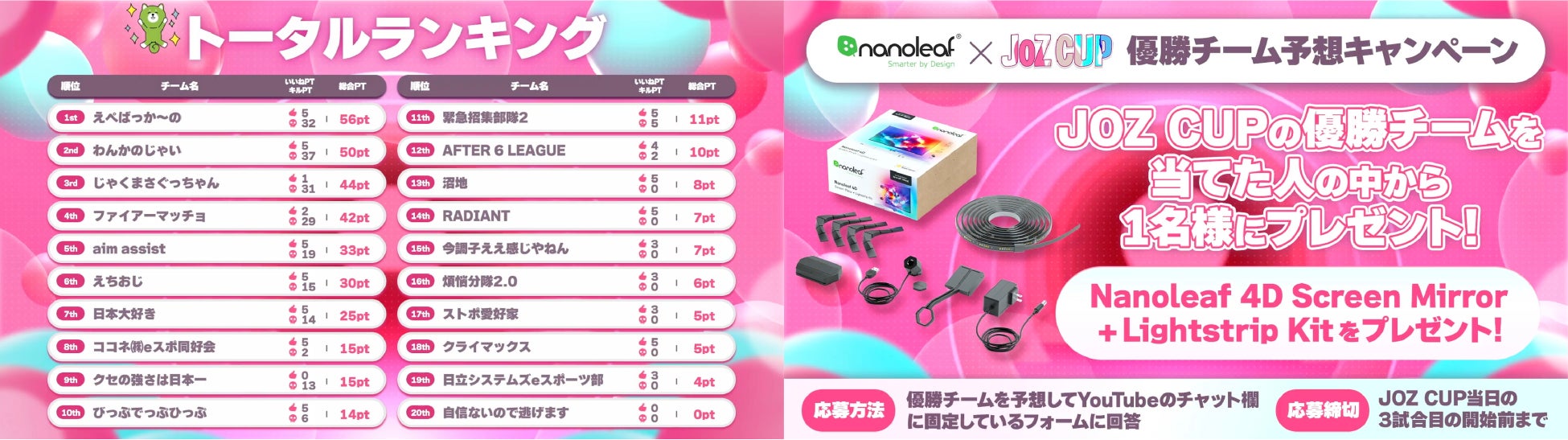 JOZ CUPは、いいねポイントやポテトランキングなど独自のポイント/ランキングシステムを持ち、エンタメ性の高い追加ルールもあります。