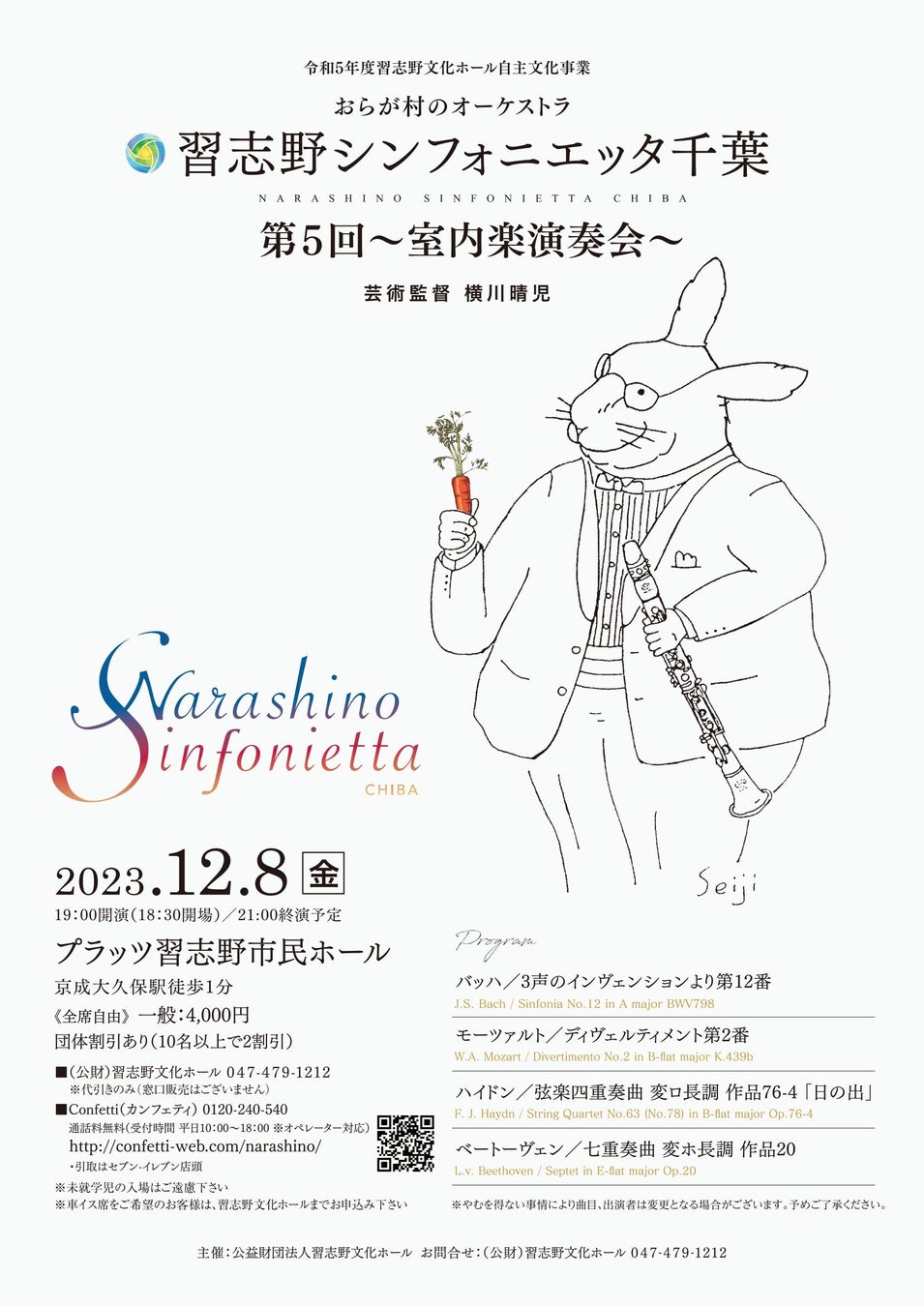 習志野シンフォニエッタ千葉は、12月8日にプラッツ習志野市民ホールで室内楽演奏会を開催します。