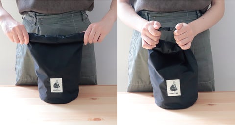 口を閉じる際は巻くだけで、中身の量に合わせてサイズ調整が可能です。