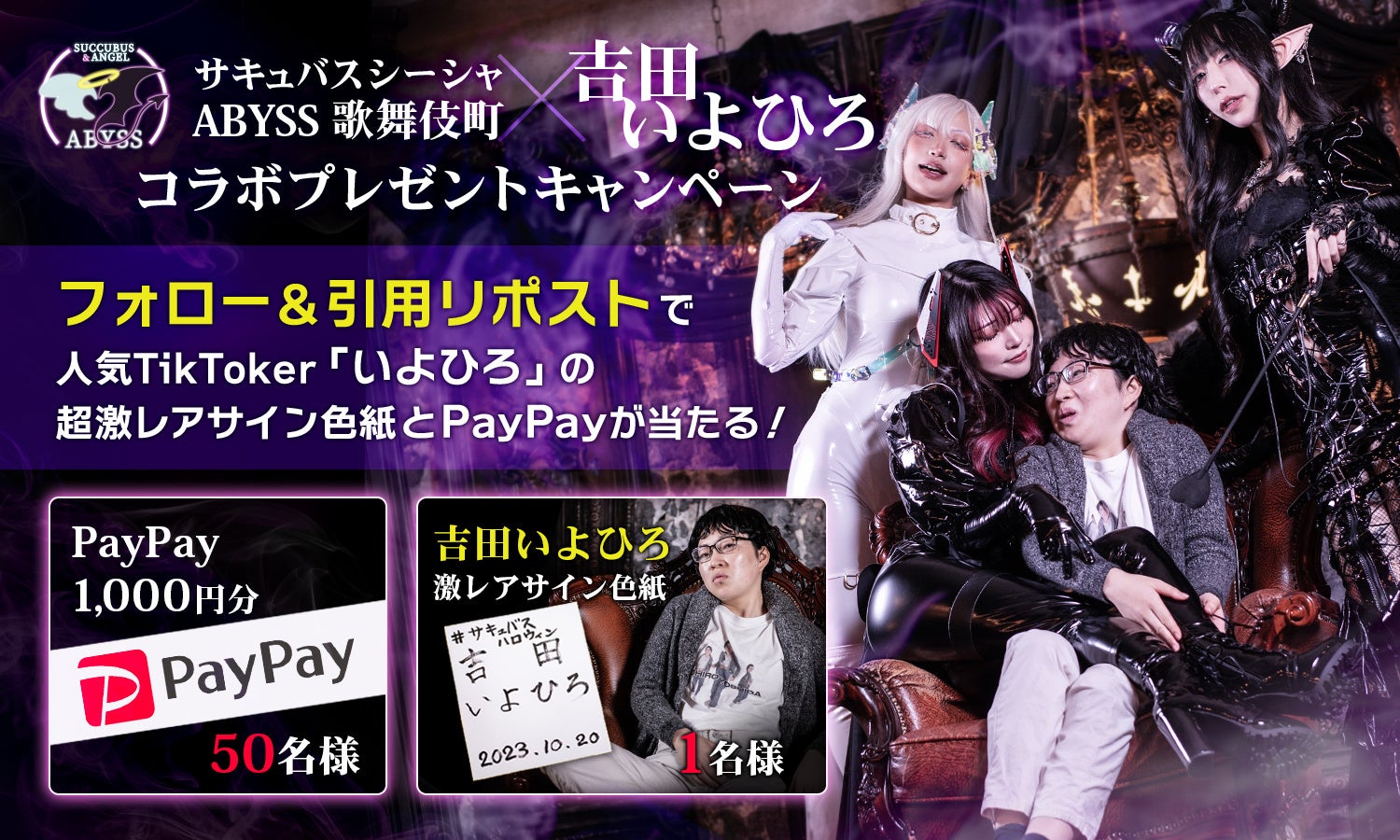 人気TikTokerの吉田いよひろとコンセプトカフェが異色コラボ!応募条件をクリアして豪華景品を手に入れましょう!景品は吉田いよひろの貴重なサイン入り色紙とPayPay 1,000円分です。