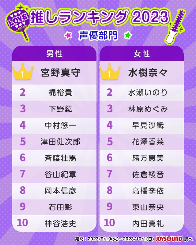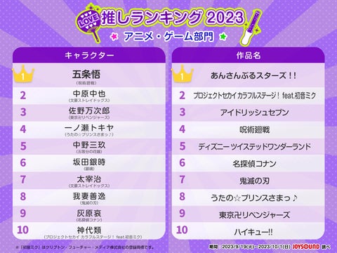 調査では、JOYSOUNDユーザーによる推しランキングや声優ランキング、アニメランキングが発表されました。