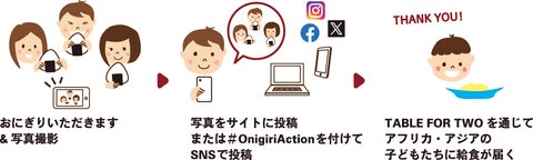 参加者はSNSや特設サイトにおにぎりに関する写真を投稿し、協賛企業が寄付し、アフリカ・アジアの子どもたちに給食5食が届けられます。