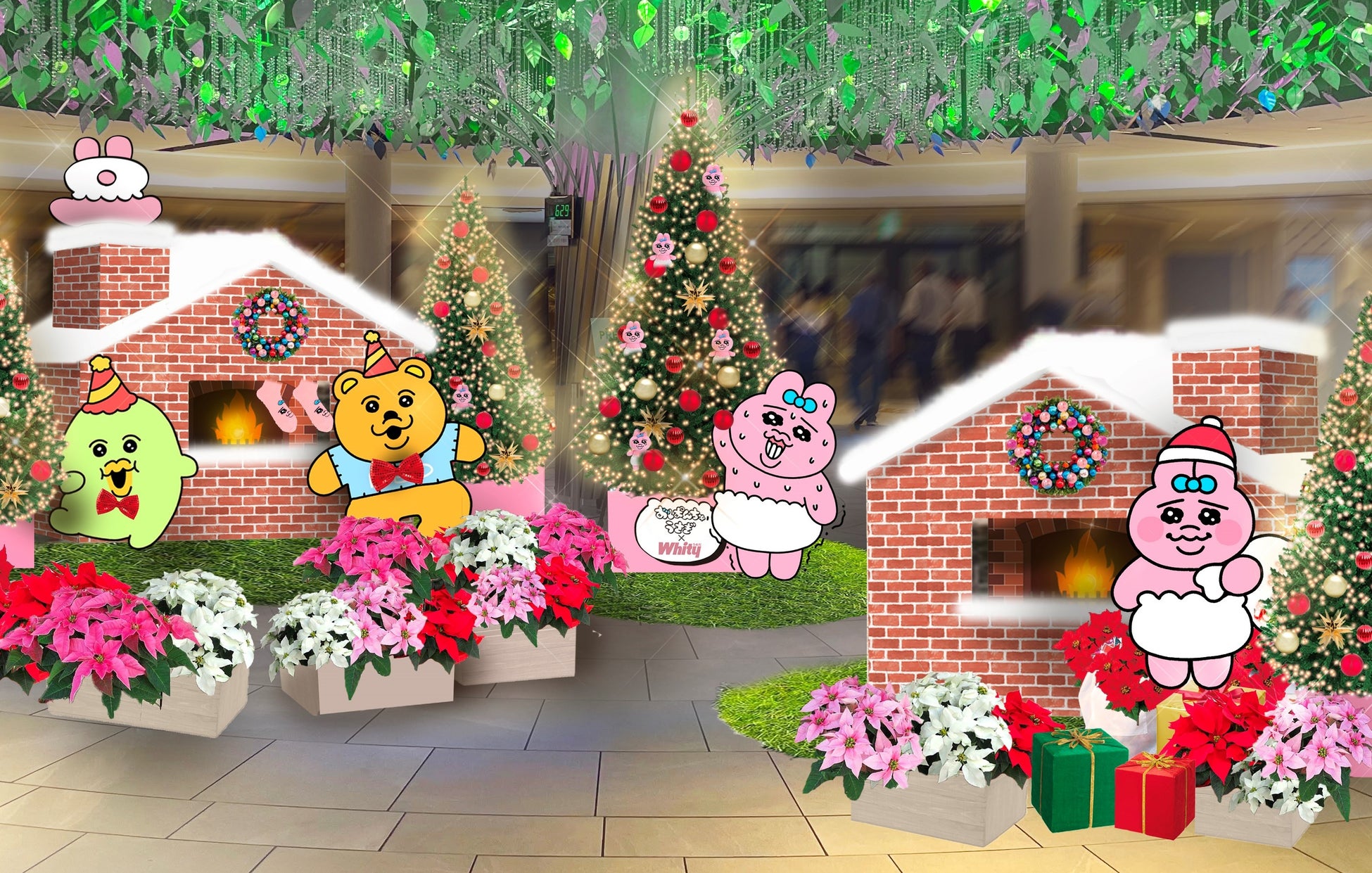 このイベントは、おぱんちゅうさぎとクリスマス装飾がコラボレーションしたもので、おぱんちゅうさぎがクリスマスオーナメントを取り付けたり、プレゼントを配ったりする様子を、鮮やかなポインセチアと一緒に楽しむことができます。