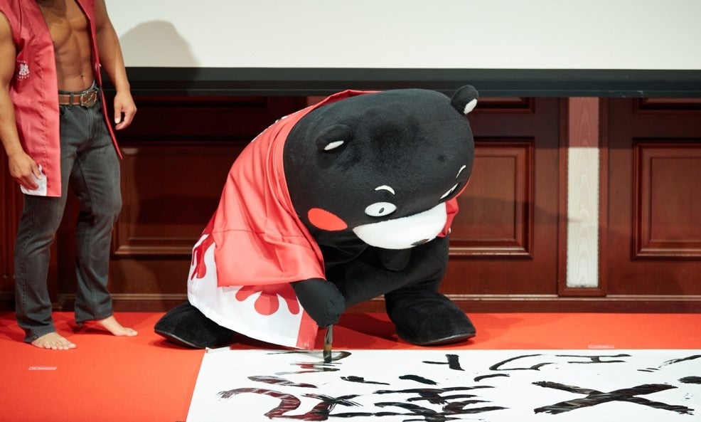 熊本県の営業部長兼しあわせ部長である「くまモン」が、新しいコンセプト「熊×熱」を書道パフォーマンスで初めて披露しました。