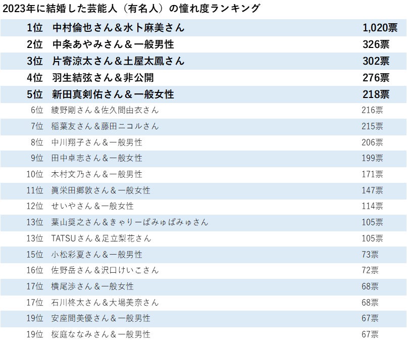 2023年に結婚した芸能人・有名人の憧れのカップルランキングが発表されました。