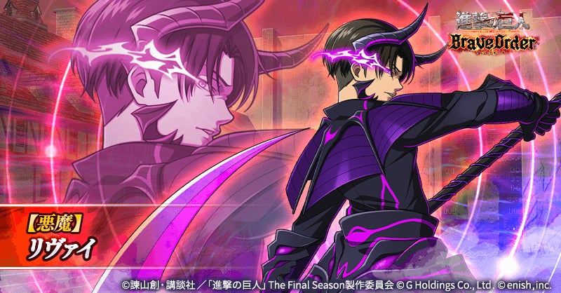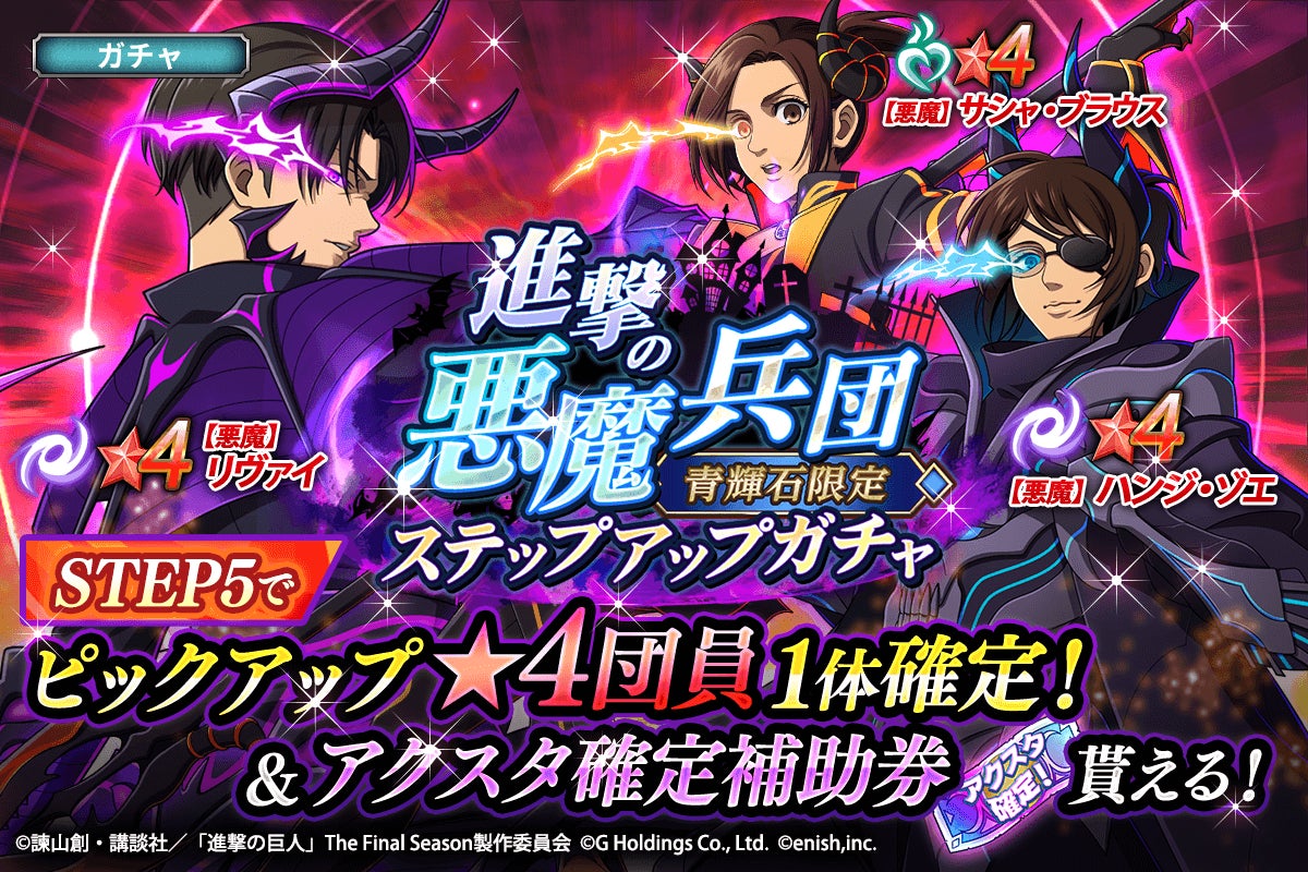 また、新登場の【悪魔】リヴァイ、【悪魔】サシャ・ブラウス、【悪魔】ハンジ・ゾエがピックアップされた「進撃の悪魔兵団ガチャ」も開催されます。