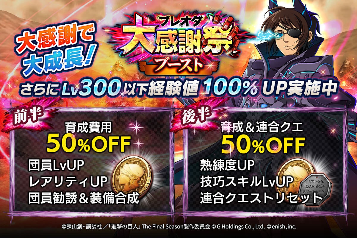 ブレオダ大感謝祭、大感謝祭グッズキャンペーン、育成費用半額、戦術Lv300、獲得経験値、大感謝祭ブースト、進撃の悪魔兵団ガチャ