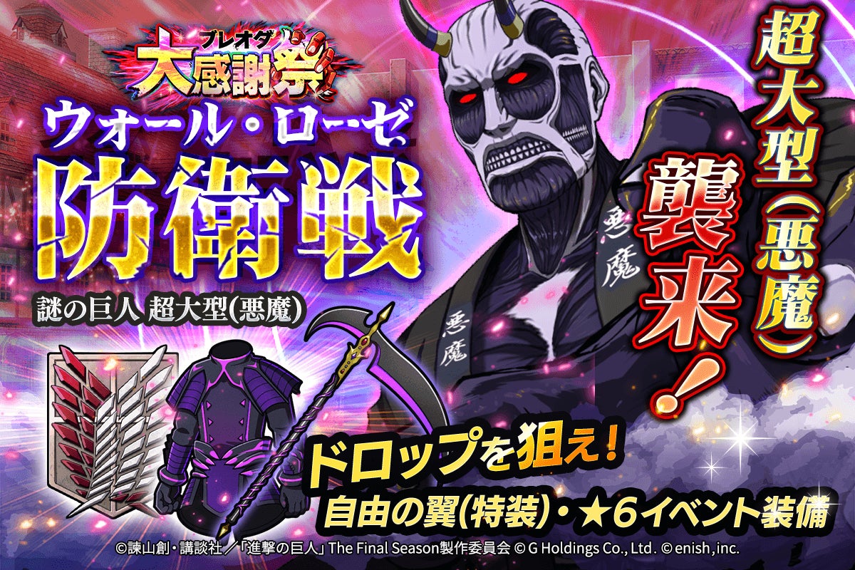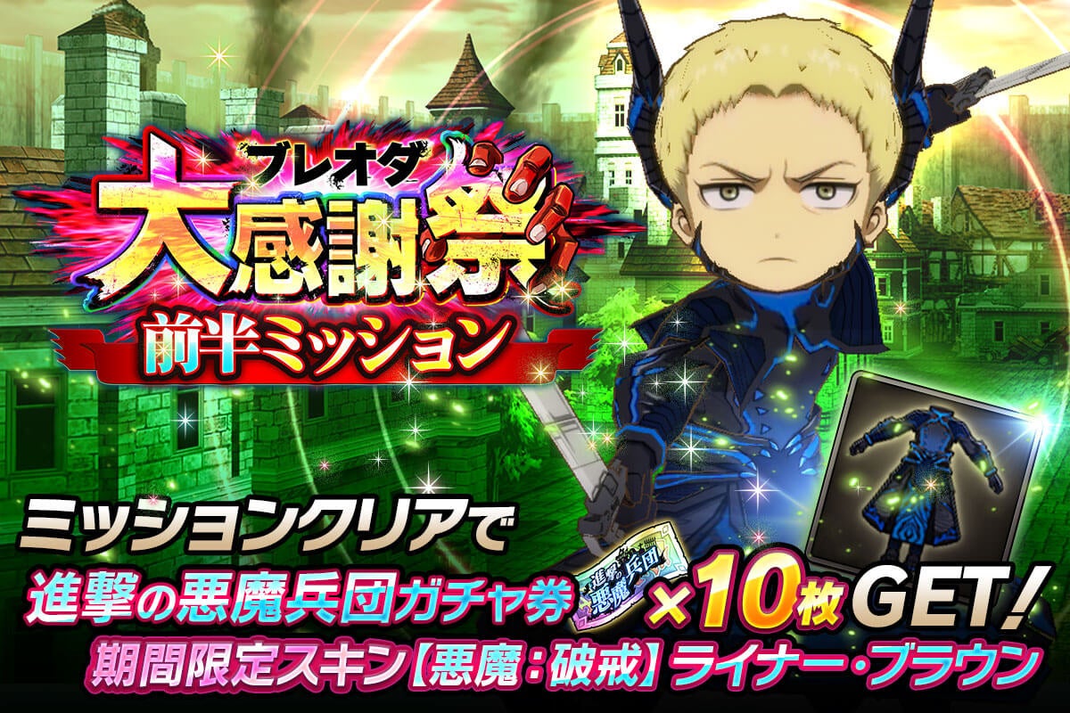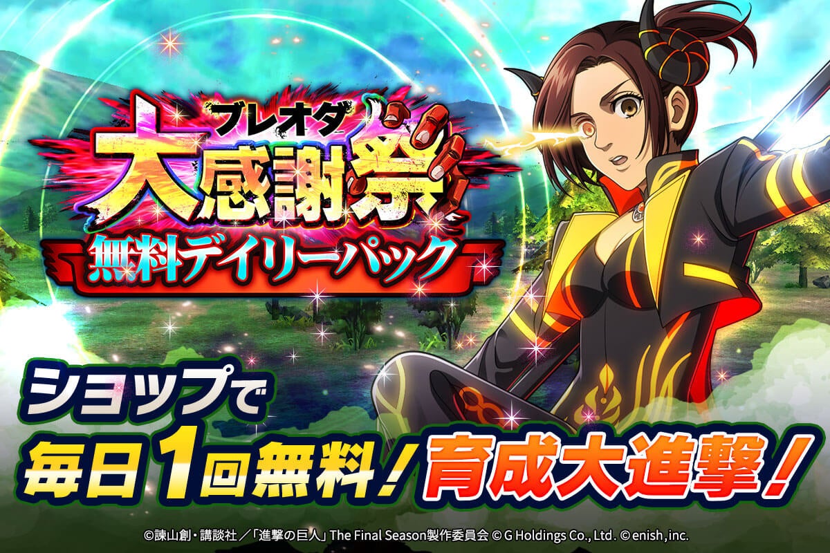 株式会社enishは、スマートフォンゲーム「進撃の巨人Brave Order」にて、11月7日から「ブレオダ大感謝祭」を開催します。