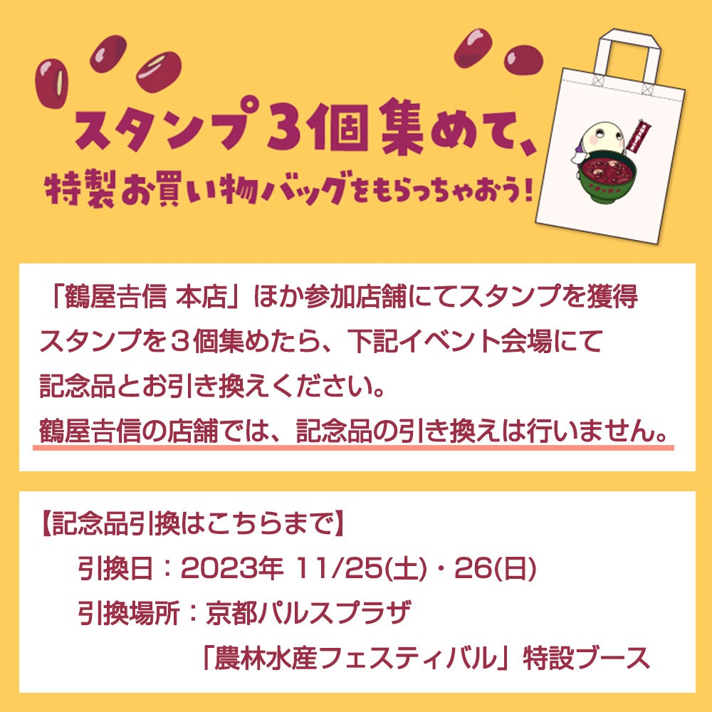 対象商品の「京べに 小倉あん」と「鶴屋吉信ようかん 小倉」を1点ご購入ごとにスタンプを進呈し、3個集めると「お買い物バッグ」をプレゼントします。