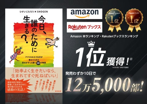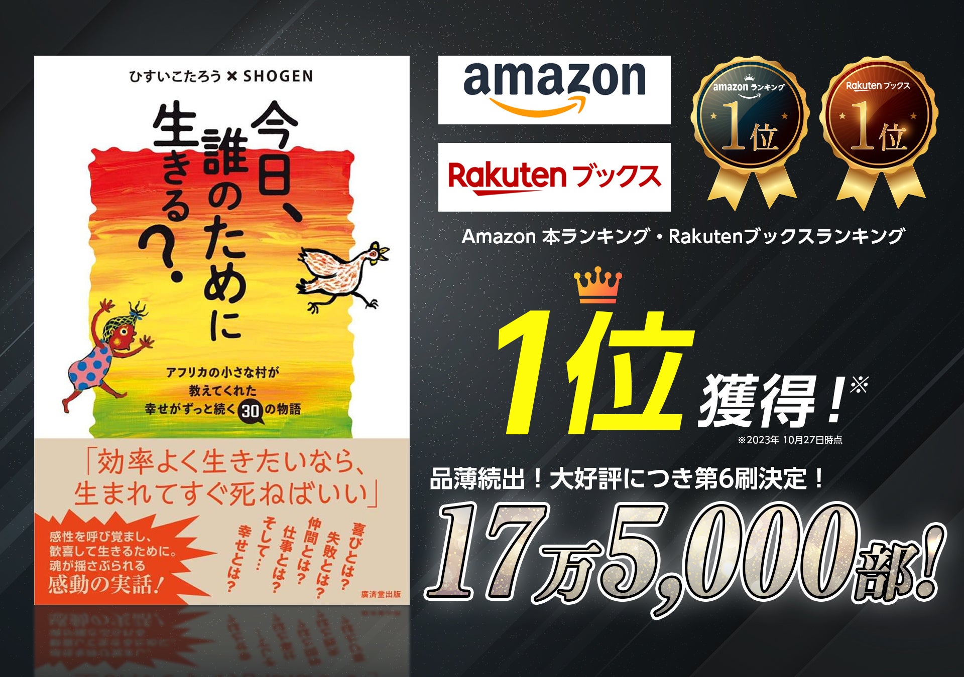 弊社のマネジメントペンキ画家SHOGENとベストセラー作家ひすいこたろうがコラボした本書「今日、誰のために生きる?アフリカの小さな村が教えてくれた幸せがずっと続く30の話」が発売され、わずか10日で125,000部の重版が決定しました。