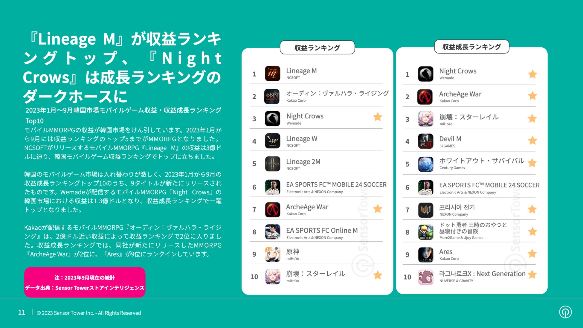 - 『Lineage M』が収益ランキングのトップ、『Night Crows』も成長ランキングで注目