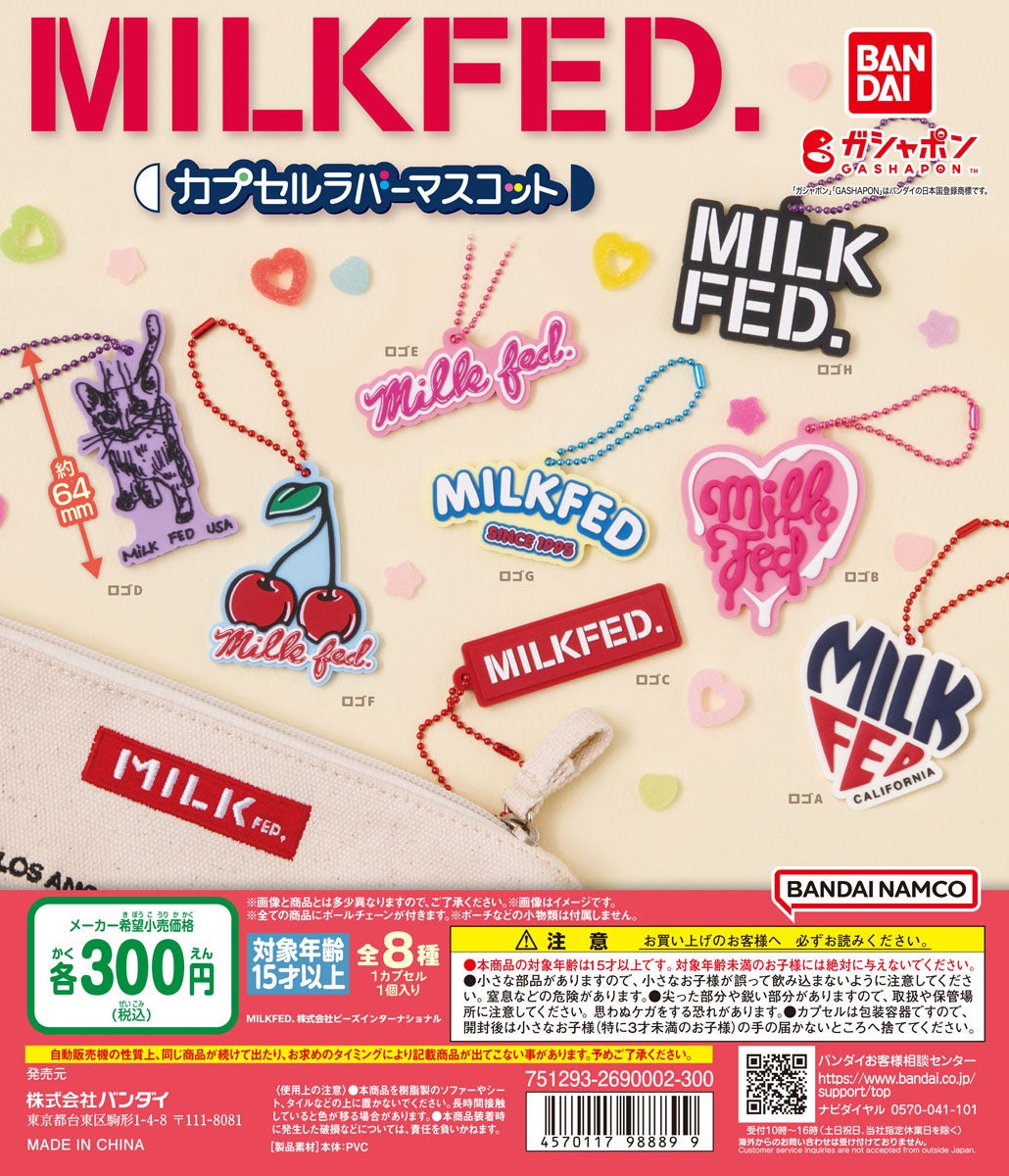 株式会社バンダイ ベンダー事業部は、アパレルブランド「MILKFED.」のロゴを使用した『MILKFED. カプセルラバーマスコット』を2023年11月第2週から全国のカプセルトイ自販機で販売します。
