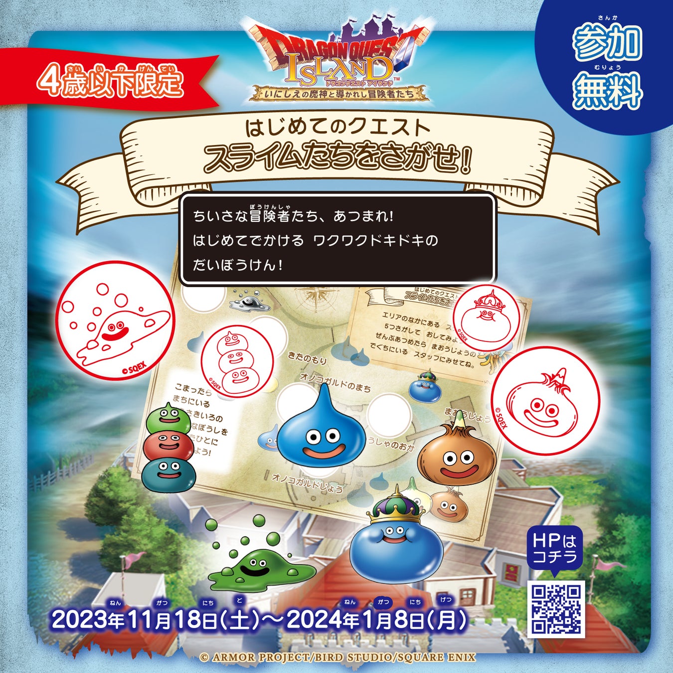 「ドラゴンクエスト アイランド」では、4歳以下のお子様向けに「スライムたちをさがせ!」クエストが開催されます。