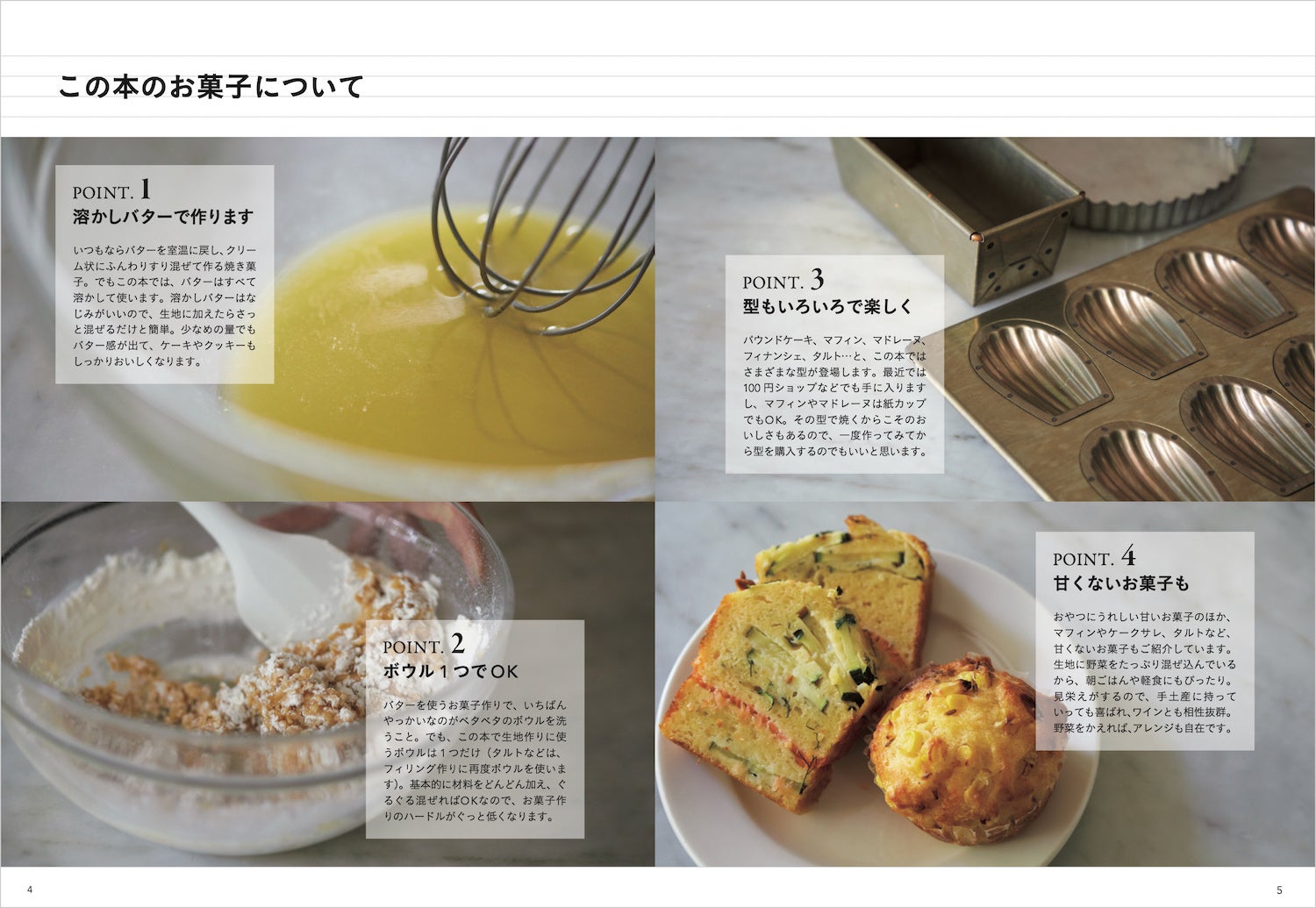 この本は、溶かしバターを使ったワンボウルのお菓子の基本から、さまざまなレシピが詳しく紹介されています。