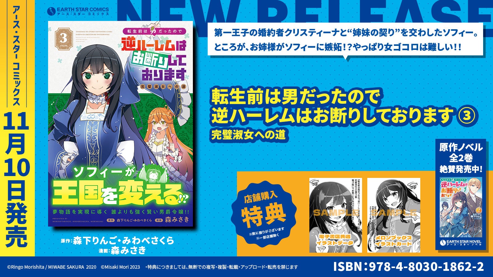 株式会社アース・スター エンターテイメントから、人気作品『転生前は男だったので逆ハーレムはお断りしております 完璧淑女への道』の第3巻が11月10日に発売されます。