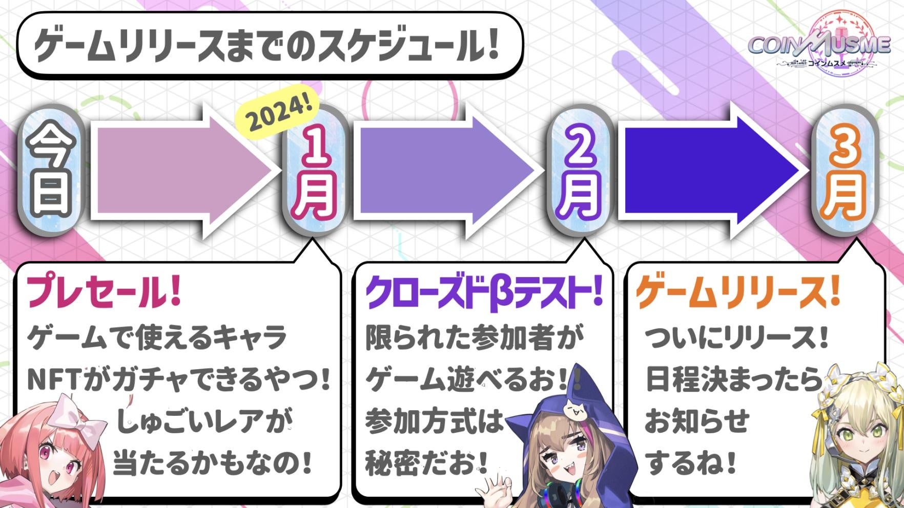 リリースに先立ち、2024年1月にはNFTのガチャ販売形式のプレセールが行われ、2月にはクローズドβテスト(CBT)が実施されます。
