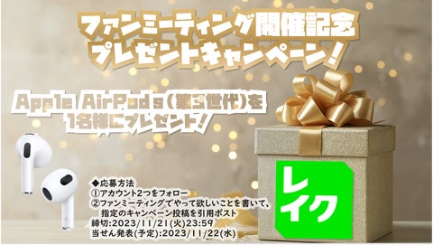 また、ファンミーティング開催を記念して、AirPodsが当たるキャンペーンも実施されています。