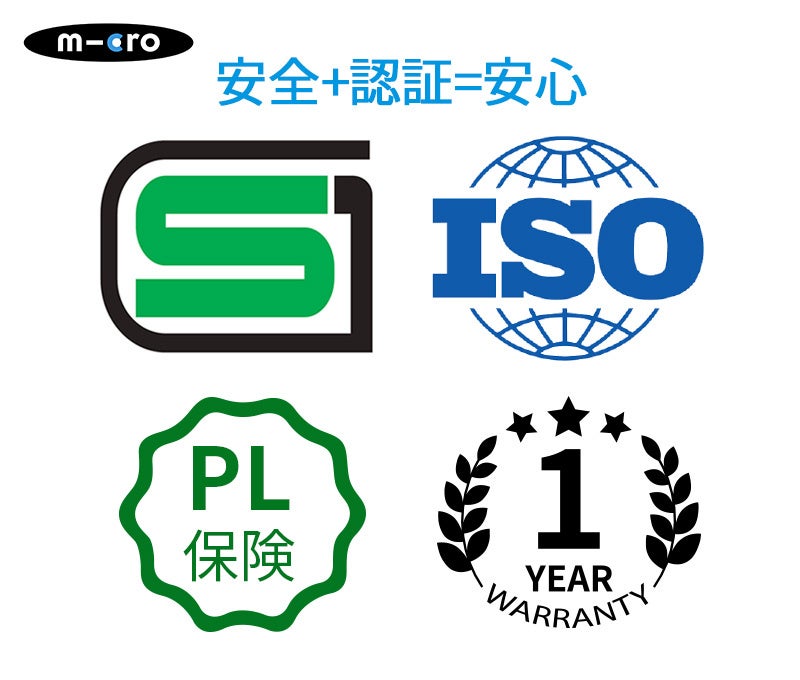 日本の安全規格「SG」を取得、信頼できる「ISO工程システム」採用、安心できる「PL保険」加入済み、1年間のメーカー保証付き等マイクロスクーターではお子様が安全に安心して楽しんでいただけるよう最善を尽くしております。