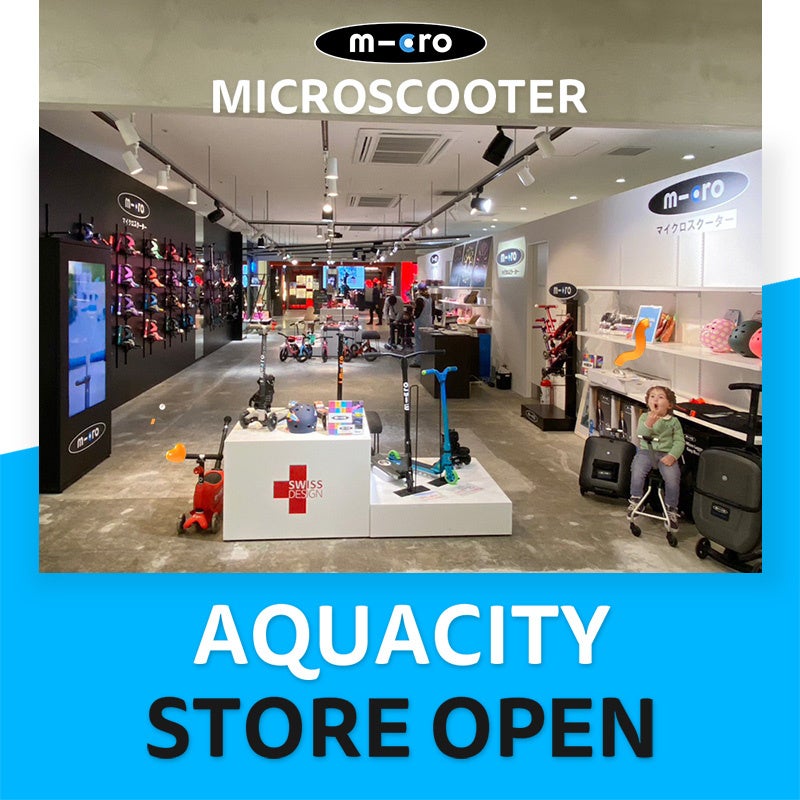 アクアシティお台場3階に日本最大級のマイクロスクーター体験型店舗をオープンしました。4月1日から5月31日まで子ども用から大人用までキックボードの試乗はもちろんプレゼントキャンペーンも実施致します。