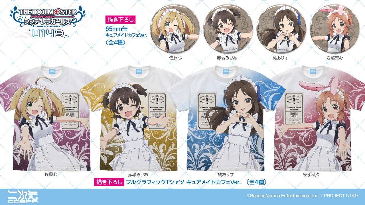 橘ありす、赤城みりあ、佐藤心、安部菜々の4人がCURE MAID CAFÉの制服姿で描かれたアクリルスタンドやタペストリー、缶バッジなどが登場します。