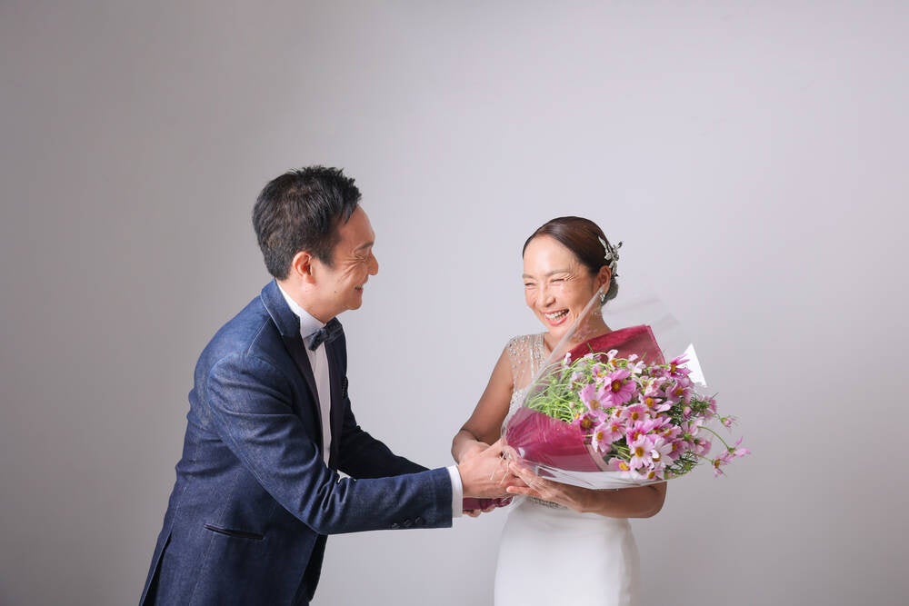 久保田様ご夫妻も参加し、旦那様がコスモスの花束を贈り、奥様に再び結婚を申し込みました。