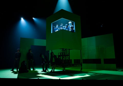 - 舞台上は照明や機材が剥き出しで、セットも無造作に置かれる