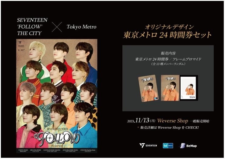 株式会社ビーマップは、HYBE JAPAN主催の「SEVENTEEN ‘FOLLOW’ THE CITY」開催を記念して、再販される「SEVENTEEN×東京メトロオリジナル24時間券」とコンテンツプリントサービスの限定フレームブロマイドのセット商品の販売に協力しました。
