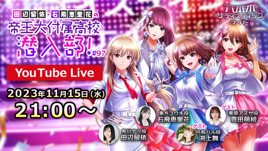 株式会社ボルテージは、カード型サスペンスアプリ「六本木サディスティックナイト」の公式YouTube番組「田辺留依・石飛恵里花の帝王大付属高校潜入部!」の特別回を11月15日(水)21:00より生配信することを発表しました。