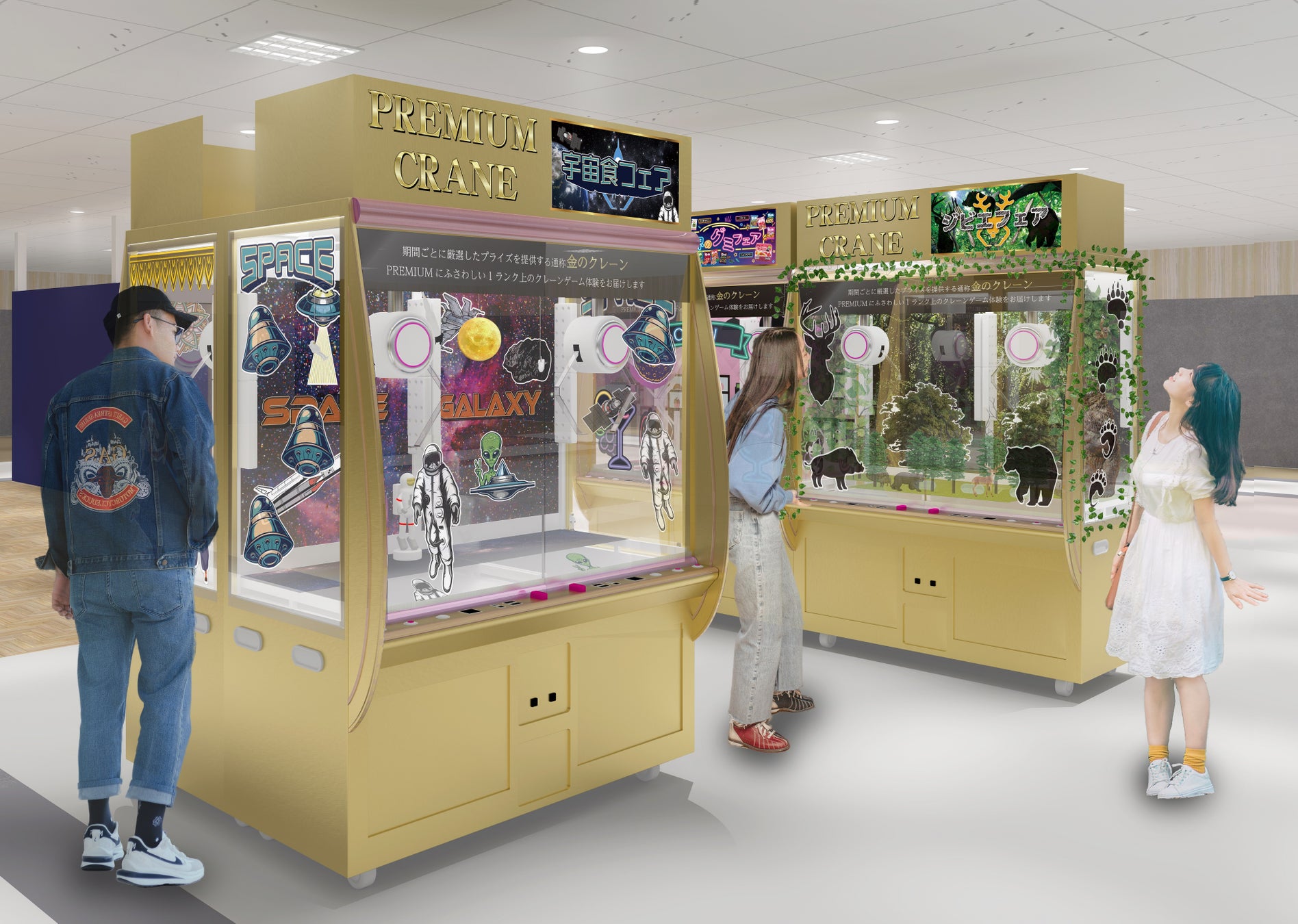 店内には、高級感のある金色のクレーン機や小型プライズを集めた「ミニクレのデパート」、バンプレストプライズを取り扱う「バンプレヤ」などのコーナーがあります。
