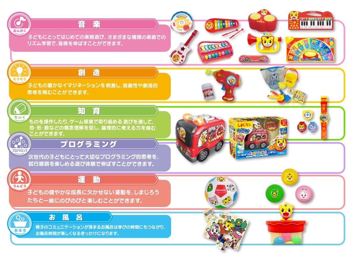 また、ハピネットはベネッセコーポレーションと共同開発したしまじろうのおもちゃシリーズを展開しており、子どもの発達と教育に合った商品を提供しています。