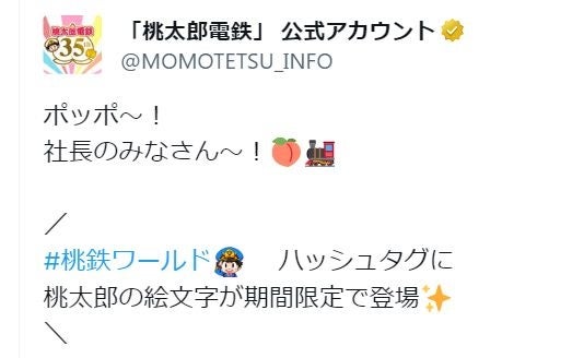 また、X(旧Twitter)では、投稿に「#桃太郎電鉄ワールド」または「#桃鉄ワールド」を付けると、桃太郎社長のオリジナル絵文字が表示されます。