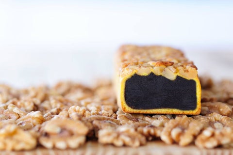 この番餅は、しっとりとした皮で包まれた豆沙餡で、表面にはローストしたクルミがトッピングされています。