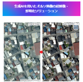 低解像度の空中写真画像及び衛星画像を、生成AIを使用して4倍の解像度に超解像化・鮮明化をおこなうソリューションです。予算の関係で高解像度の画像を撮影できない場合や高解像度の画像が存在しない場合に有効です。