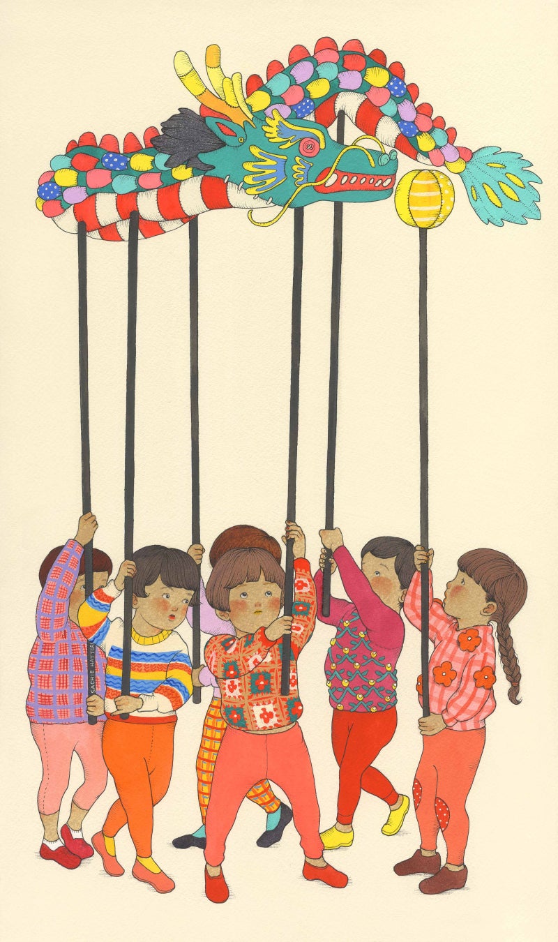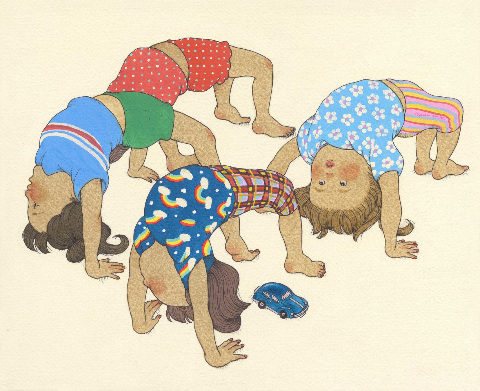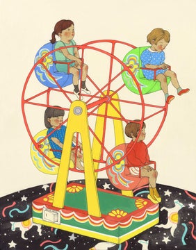 彼女は子供たちが楽しみながら軽やかに駆け抜ける姿を描いており、展示販売される作品には鮮やかな色彩が使われています。
