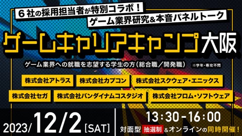 2023年12月2日(土)、アトラス、カプコン、スクウェア・エニックス、セガ、バンダイナムコスタジオ、フロム・ソフトウェアの6つのゲーム会社が共同で「ゲームキャリアキャンプ大阪」を開催します。