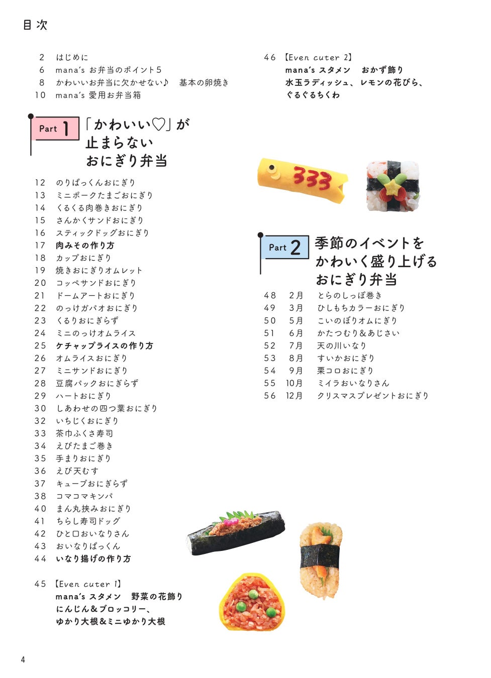 本書は、おにぎりとサンドイッチをかわいくアレンジする方法や、身近なキッチングッズを使ったアイデアなど、盛りだくさんの内容です。