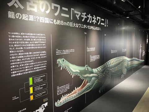 大阪大学総合学術博物館の協力のもと、太古のワニ「マチカネワニ」の化石や頭骨のレプリカ、実寸大のイラストなどで解説します。