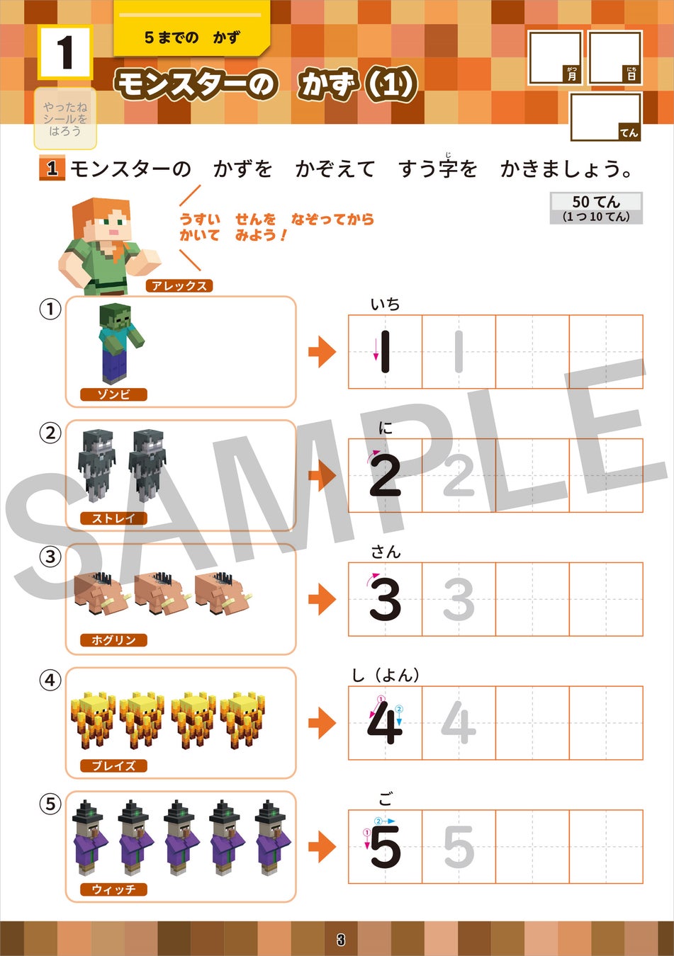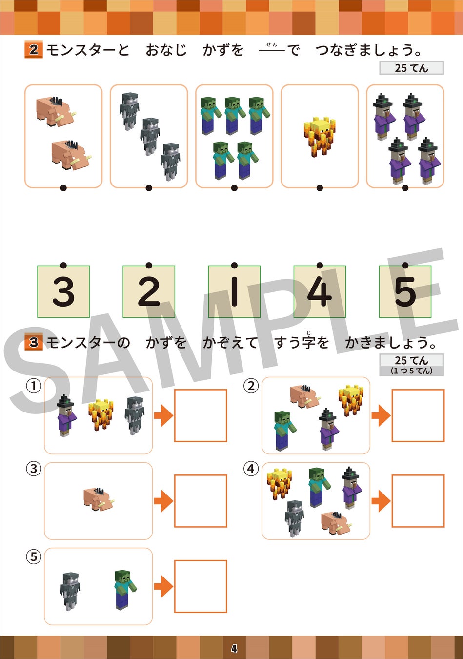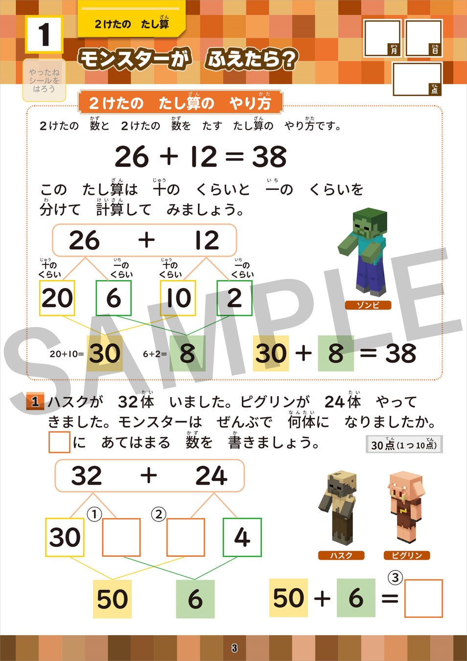 これらのドリルは、パズル感覚で計算力を鍛えることができる内容で、マインクラフトのキャラクターたちのイラストで問題が出題されます。