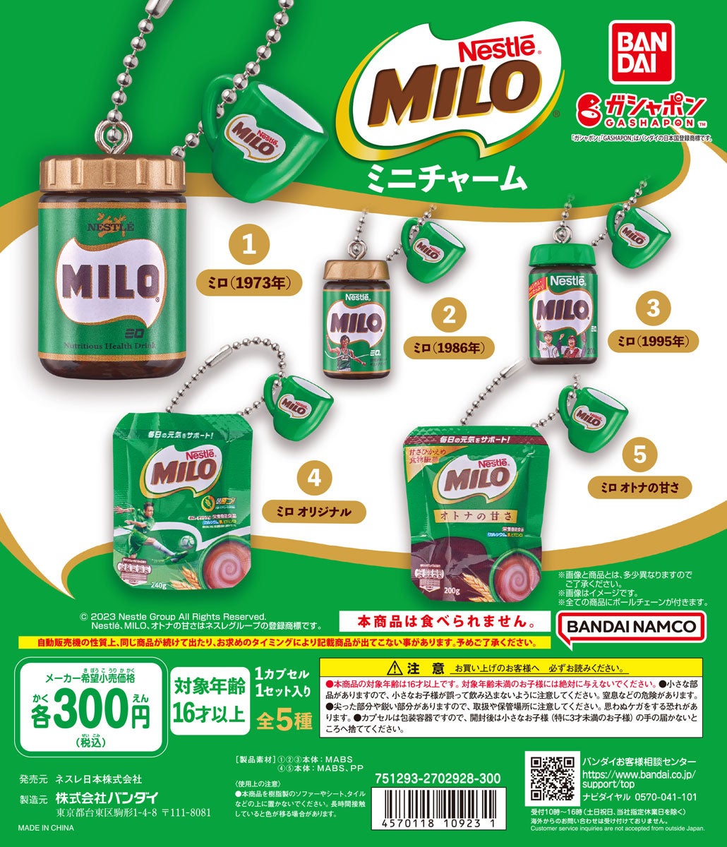 このカプセルトイ商品は、ミロのパッケージをミニチャームで再現し、ビン型と袋型のデザインが全5種類揃っています。