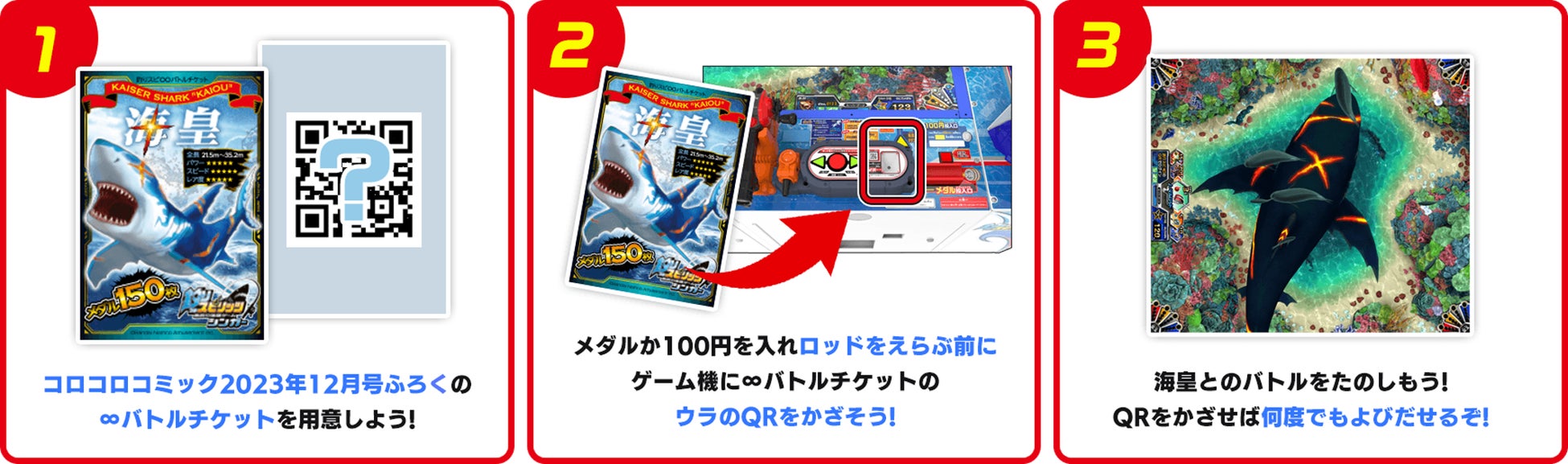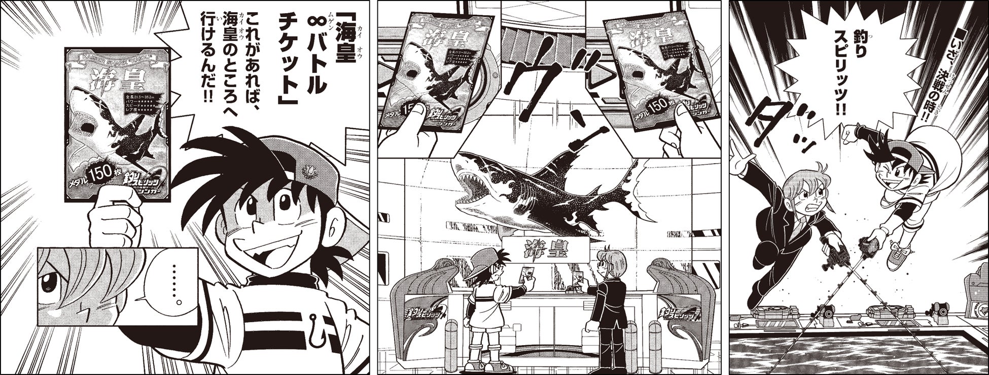 アップデートでは、マンガに登場するアイテム「∞バトルチケット」が付録として提供され、ゲームセンターでそのチケットを使って巨大ザメ「海皇」とバトルすることができます。