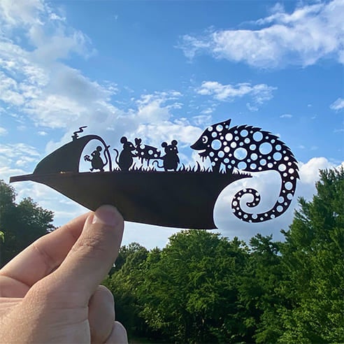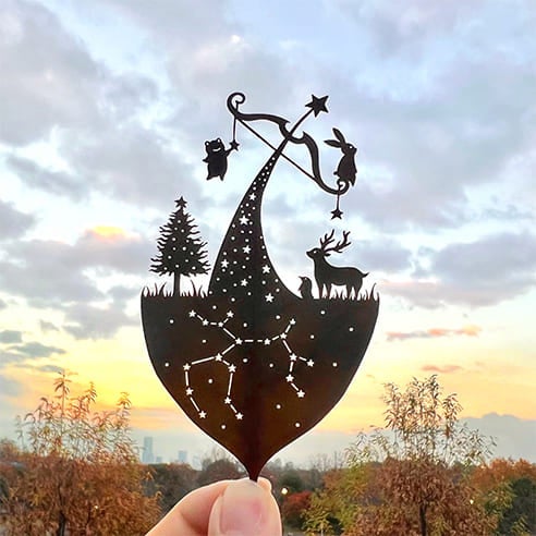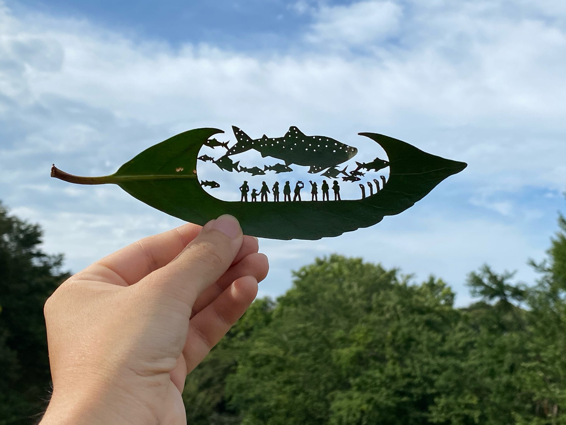 彼の作品は葉っぱから生まれるミラクルで、草木や動物、建物が生き生きと描かれています。